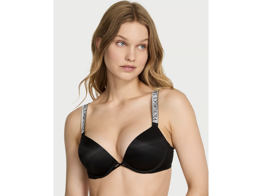 Trblietavé ramienka zdobené kamienkami a logom Victoria's Secret. Táto podprsenka dodá vašim prsiam neskutočný objem a vytvorí dokonalý dekolt. Jemné a zároveň provokatívne, sofistikované a žiarivé. Stelesnenie všetkého, čo milujeme. Odvážny štýl: táto push-up podprsenka s maximálnym zdvihnutím je zdobená lesklými ramienkami s logom a koketnými prekríženými pásikmi vpredu.